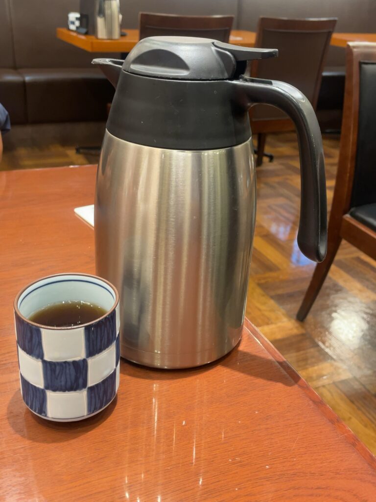 12時前に店舗に到着しました。店舗はさほど混み合ってなく、すぐに案内されました。入ってすぐのテーブル席に案内され、席に着いた時に目に入った、卓上にあるセルフのほうじ茶で喉を潤しました。暑い日には有難い🫠