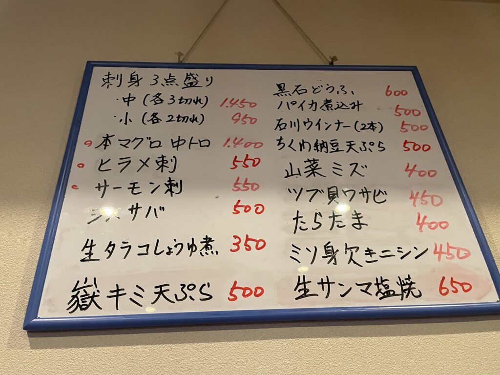 お店に到着したの19時前くらいだったでしょうか、店内はちょうど1席だけ空いており、すんなり入店。その後から続々お客さんが来てました。営業マンより後のお客さんは「満席ですー。すみません!」とお断りされてました。間一髪のタイミングでした😅店内はザ居酒屋って感じでどこか落ち着く古風な居酒屋って感じの内装でした。カウンター席が10席くらい、右手側に四人掛けテーブルが4つありました。営業マンの考える、昔ながらの居酒屋のちょうどいいサイズです☺️落ち着きますねぇ。早速メニューに目を通します。