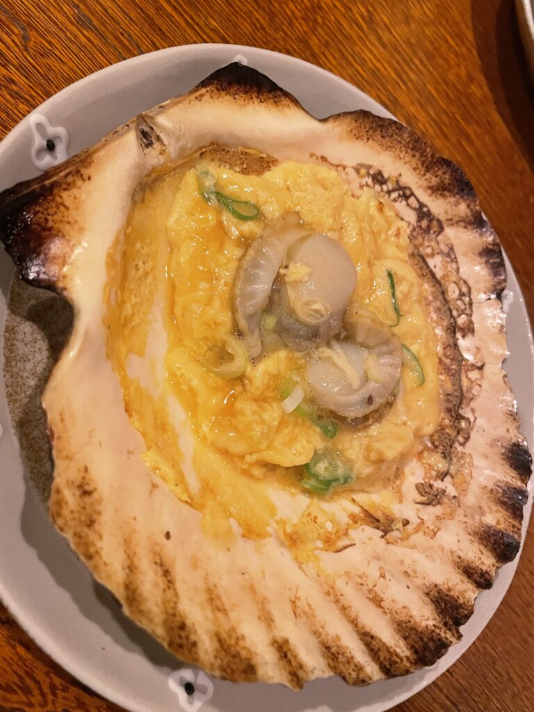 とりあえず、瓶ビール(赤星)これはめちゃくちゃ好き。美味い🍺メニュー表を見ていると初めてみる料理に興味を惹かれたので、頼んでみることに「黒石とうふ」「たらたま」「ホタテの貝殻焼き」など、数種類頼みました。お通しに出てきた、冷製に仕上げられたあさりは逸品でした。(写真撮り忘れた😭)出汁が効いていて、締めに食べたいかも🤤って思いました。お通しでビールを飲み干してしまった営業マンです。すぐに、ホタテの貝殻焼きが到着したので、急いで日本酒を注文しなくては!と思って、迷っていたのでおすすめを聞いたら飲み比べがいいかもですね!って言われたので、日本酒の飲み比べを注文しました。