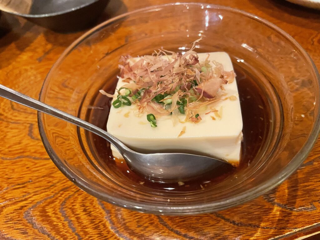 お次は、見た目は普通の豆腐と変わらない感じ。一口食べてみると、硬めでしっかりしているのに口に入れるとホロホロと崩れていく感じが新鮮です。濃い目の大豆の風味を感じます。セットなってる醤油らしき物といただきます。濃い大豆の味を丸くしてくれるさっぱりとしたお汁ですね。ここに合わせたのは、華一風です。フワッと香りが一緒になり、余韻が一緒に消えていくのがまた良いですね🤤他の二つに比べると少し余韻の長めの華一風が良く合ってこれはクセになる。
