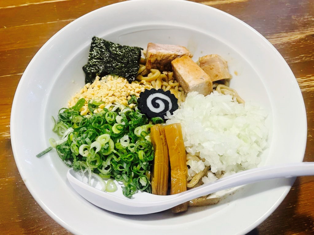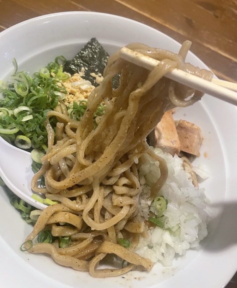 第一印象は普通のまぜそばで、黒いナルトが気を引く感じのビジュアル。麺を持ち上げるとそこには圧倒的煮干し感を纏った麺が顔を出し、強烈な香りが鼻腔を突き抜けました。自然とよだれが出てきました🤤笑