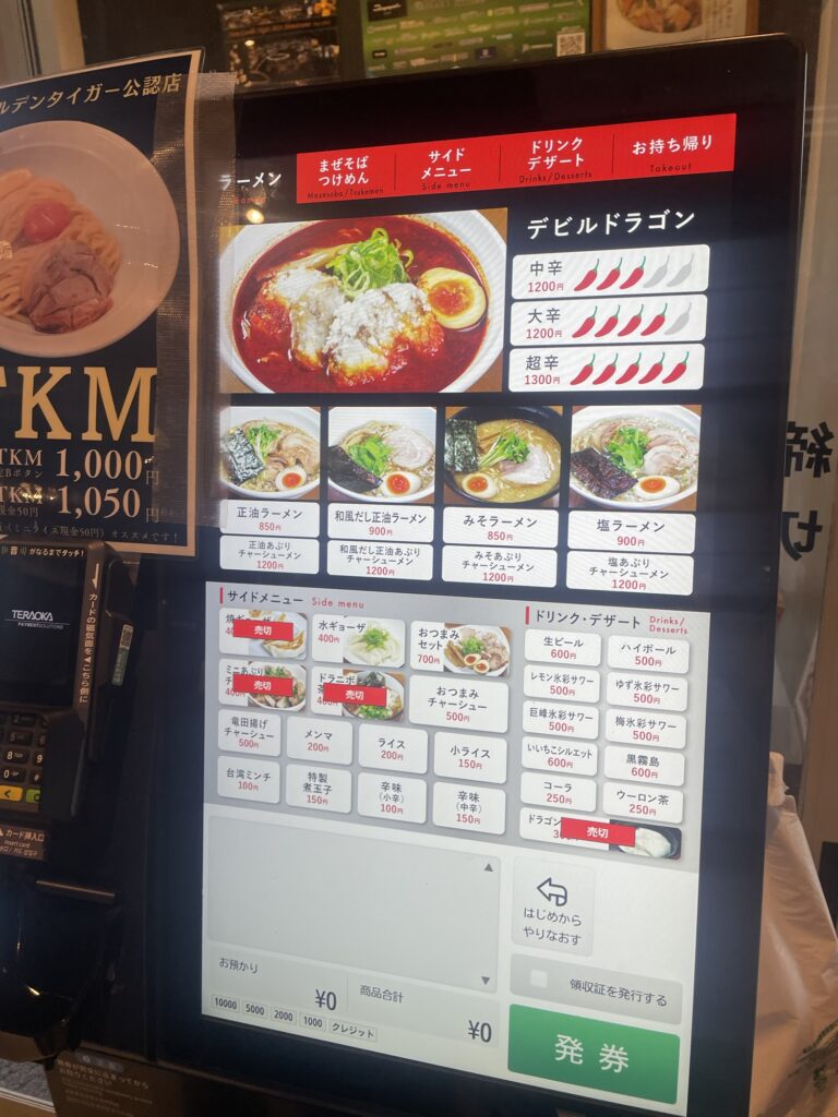到着したのは12時前。駐車場は3台〜4台程とめられて広めです。到着時、外には待ちはいなかったです。店内に入ってみると、空席が何席かあり、すぐに入店できました。客席は4人掛けのテーブル席が4個程、カウンター席が5席くらい。テーブル席でお客さんが対応できる広いお店という印象でした。電子の券売機スタイルでメニューを見て食券を購入します。初来店店舗で券売機のメニューの写真があるとスムーズに選べて助かります。弱点もあります、どれも美味しそうで、めちゃくちゃ迷うことです。笑