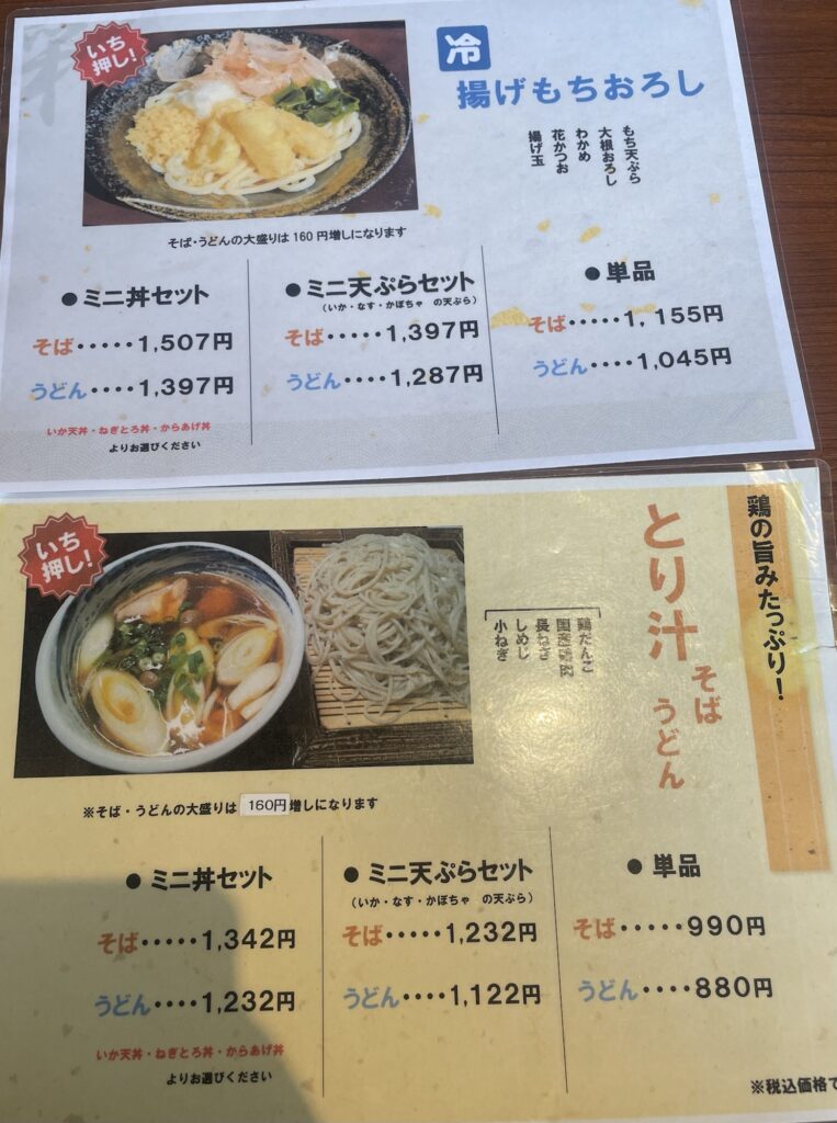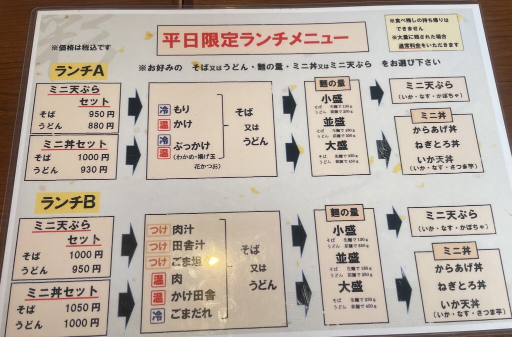 メニュー表に目を通します。なるほど、平日限定ランチがかなりお得と一瞬で見抜いた営業マン😤(大体ランチメニューはお得。笑) メニューに目を通してますが、割と複雑な感じです。AとBでうどんのグレードが違う様です。店員さんを呼び、営業マンはランチAのミニ丼セットにしました。麺の量も選べて初店舗なので残したら申し訳ないので並盛をチョイス。⚠️食べ残しの持ち帰りはできず、大量に残された方は通常料金がかかる場合がある。との明記がありました。頼んでから気づきました。。。メニューはちゃんと隅々までよく見るのが大切だと再認識しました👀!