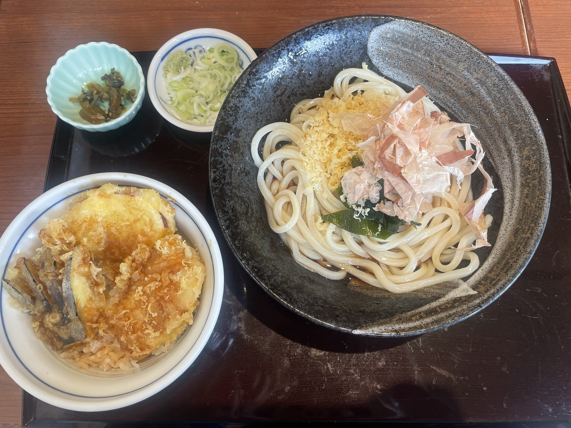 届いた瞬間天丼の油のほのかな香り、ぶっかけうどんの鰹節の香りが同時にしてきて、お腹がなりました🤤 早速うどんを一口。ツルツルシコシコです。弾力が凄まじい!噛めば噛むほど小麦の香りが口一杯に広がっていきます。啜って飲み込むのではなくて、啜ったらよく噛みましょう。そうでないと食べれません😳醤油がよく効いた出汁とうどんがマッチしてクセになる。醤油の塩味がちょうどよい感じで、気づいたらうどんを二口食べてました。見た目からも存在感を放っているトッピングの鰹節、これがまた凄い。大きいのに、うどんに良く絡み、啜ったらついてきて、口の中に鰹の香りが広がります。鰹節にマッチしている醤油の出汁、噛めば噛む程に小麦の風味が口の中に広がってゆき、一口で3回楽しめる、完成度が高いです☺️ワカメはキレのある醤油の出汁とマッチしてうどんを引き立ててくれます。控えめにのせられてる天かすもカリッと食感を楽しみ、出汁を吸っていてふにゃってなっている天かす自身の油分とキレのある出汁とマッチしていて良きです👌お次は天丼です。内容はイカ天、ナス天、さつま天です。最初にイカ天から一口。プリッと弾力のあるイカで美味!衣もサクサクな部分とタレがかかってしんなりしている部分の明暗も楽しめちゃいます。イカに細かく切れ目が入っており、火が通りやすくなっていて、更に噛んだときに切れやすくなっています。料理人さん良い仕事をしてますね😏天丼のタレは甘口で営業マン好みです。お次はナス天を一口。ナスが油を吸っていてジュワッと感と、タレの甘さとナスの甘味がマッチしてこれはクセになる。最後にさつま天です。この季節には欠かせない一品ですね。タレの甘味を最初に感じ、程なくするとさつまいものほんのりとした甘味を感じでこれは美味です!途中で、お漬物を楽しみながら、ネギをぶっかけて食べ進めて、あっという間に完食です。