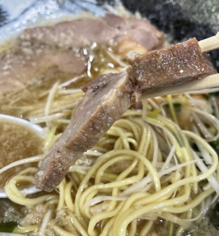 驚きのビジュアルです🫢丼が大きいし肉厚チャーシューが5枚も乗ってるし、背脂たっぷり浮いていて、ネギもどっさりのってます!ワクワクが止まりません。早速スープから一口。口に入れた瞬間香る醤油の優しい香りと豚骨の香り、そこに足された背脂の脂感。醤油と背脂の甘さがマッチして口いっぱいに広がりスルッと体に入ってくる感じがクセになる。脂多めなのにスルスル入ってくる飲みやすいスープ。醤油が辛口じゃないのがまた良い!マイルドな仕上がりになってますね。気になるのはやや化調の味も強めで舌がピリッとする感じがありますね。うん、素直に美味しい😋