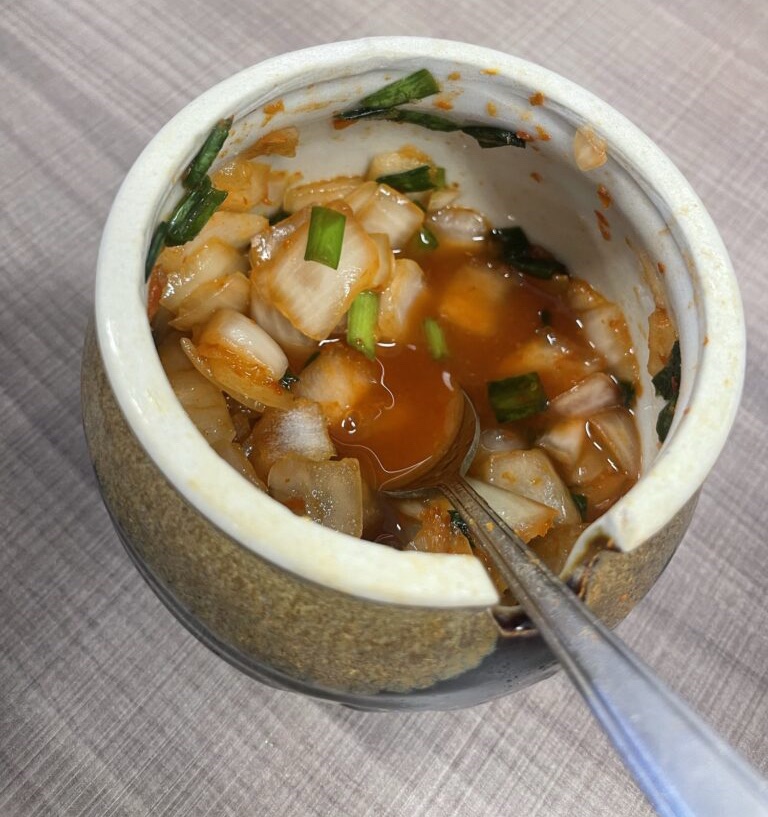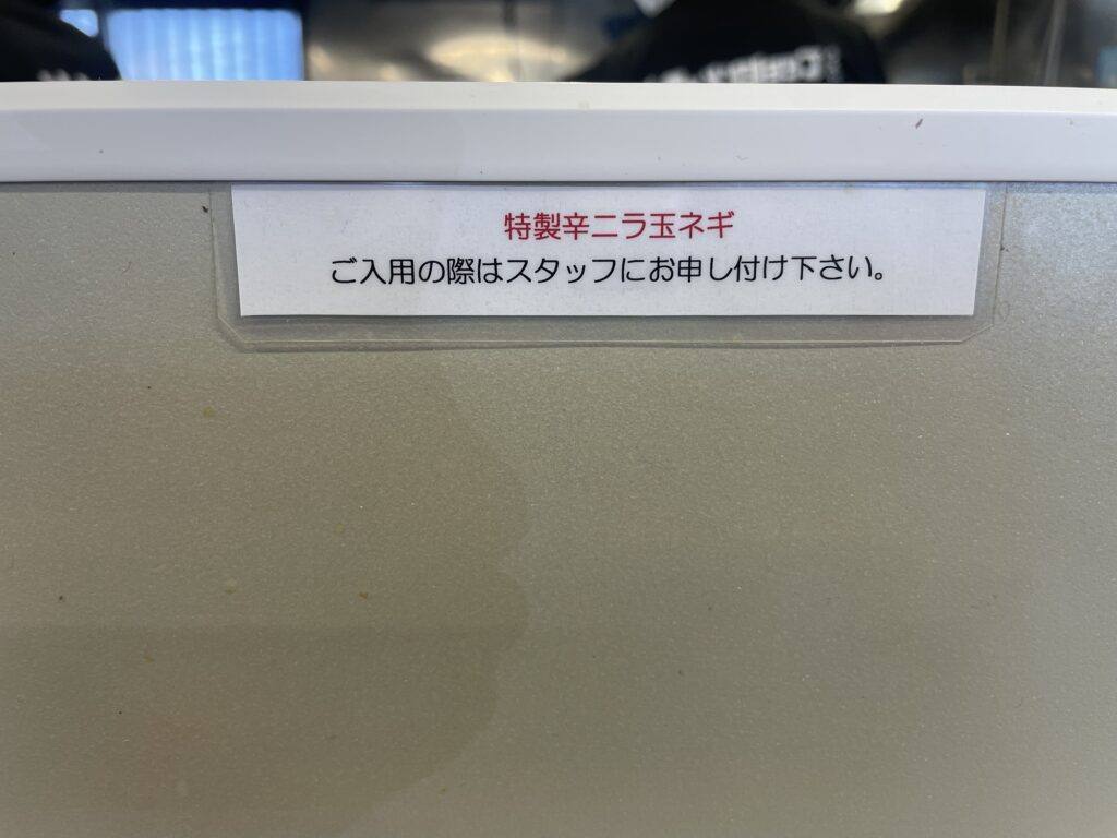 味変を1つだけします。特製辛ニラ玉ねぎです。店員さんに言うともらえます。トッピングして一口。辛い!玉ねぎの辛さとキムチっぽい辛さがあってインパクトが結構あります。どこかの居酒屋さんで生キムチと言う品名で置いてあったキムチを彷彿とさせる浅めに漬けられたキムチの様な感じです。こちらも長ネギ同様にスープの熱で少し火入れをして、、、って思ったらスープは最後の方だったので熱々ではなくなってました。笑