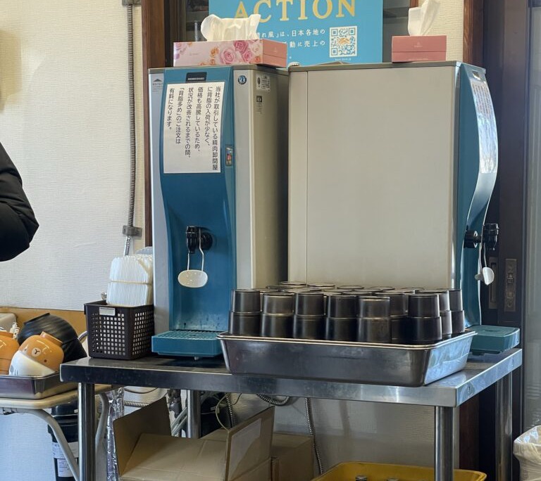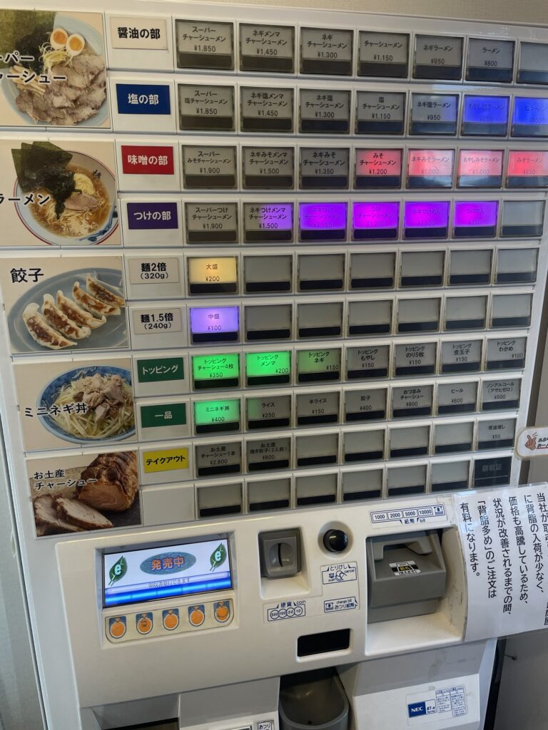 券売機で食券を購入してオーダーするシステムです。やっぱり看板にもある様にネギチャーシューのラーメンにしようかな。と思って即決でした。あ、背脂増し50円、、、増しましょう!脂増しが有料なのはこのご時世仕方のない事ですね。甘んじて受け入れます。食券を購入したら店員さんに渡します。お好みを聞かれましたが今回は背脂多めはオーダー済みのため普通でお願いします。とお伝えしました。因みにお冷はセルフサービスです。店舗入ってすぐに設置されてあります。