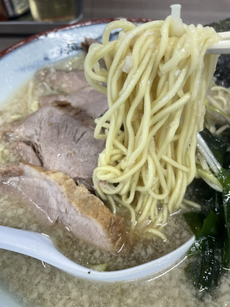 お次は麺を一口。中細のストレート麺でやや加水くらいの部類でしょうか。色味はやや黄色で麺はツルッとしていて、小麦感が控えめになってますね。スープを吸ったりしていて、調和がされる様なタイプの麺ですね。麺を啜るとスープと背脂がよく絡んできて食べやすさ◎です😊程よく溶けている背脂と粒々の背脂のコントラストがまたクセになる。麺を食べる時にトッピングのネギも一緒に一口。うん!美味い!ネギはごま油で和えており、醤油のスープと麺との相性も抜群です。食感はシャキシャキしていて、ネギの辛味もあり、水にさらしてないタイプのネギですね。スープの熱でしんなりしてきた頃にまた食べようと思った営業マンでした。勿論シャキシャキも好きですけど、しんなりしてる方が好きです。笑