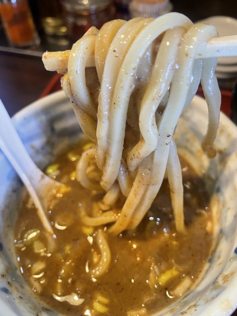 麺がツルツルで極太、魚介の香りがふんわり香ってくる。求めていた感じのつけ麺です☺️スープを早速一口。熱々のスープは、ドロっと感があり、魚介の香りが一気に口の中に広がっていきます。飲み込んだ後にも魚介の香りが口の中に残るくらい濃度があります。魚粉の割合も多く舌触りはザラっとした食感もあります。ネギが大量に入っていて、ネギを避けないとネギ味のつけ汁になります。これが個人的にはマイナスポイントですね。笑 ゆずの皮も少し添えられていて、魚介豚骨と柑橘圭を合わせるスタイルを再現していて良きです。魚介の中に偶に香る柑橘それと酸味にはキレがあってこれがクセになる