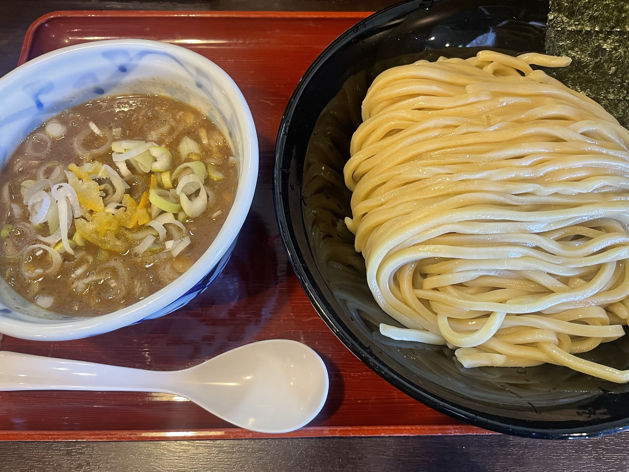 お次は麺を一口。極太でずっしりとする食感。しっかりとつけ汁が絡みます。麺は小麦を味わうにはちょうど良いくらいの硬さと太さです。濃厚なつけ汁の場合、啜っても麺が太いのでちゃんと絡んでくれて、つけ汁と麺を一緒に味わえる所が良きですよね😏極太の麺と魚介豚骨のつけ汁がマッチしてクセになる。一つだけ問題があるとすれば、ネギが多くてネギ汁を食べているのかな?って思いました。ネギ少なめとかで注文したら対応してくれるのかな?次行く事があれば聞いてみよう。そう、心に誓いました。あっという間に、麺を完食しました。残ったつけ汁には勿論スープ割りを頼みました。スープ割りの出汁は昆布出汁の様なあっさりしてる感じのスープでした。濃いめのつけ汁が程よい濃さのスープになり完飲です😋