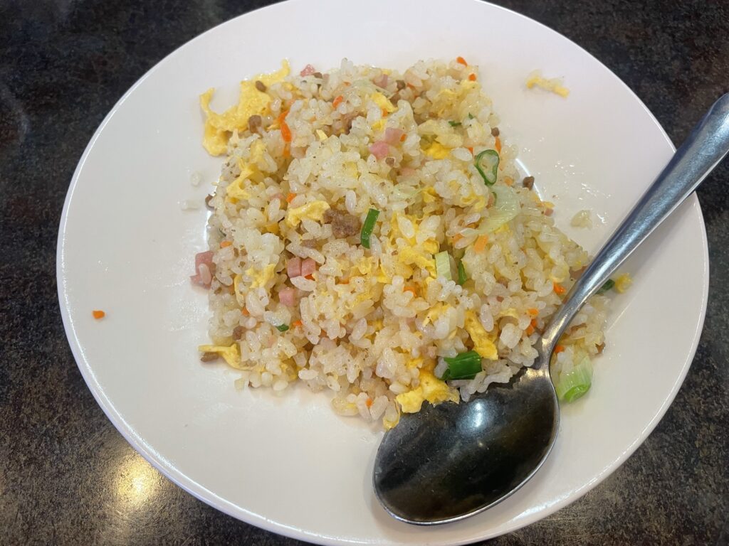 すぐに出てきたのは半チャーハンでした。もしや、作り置き。。。?そんな疑問を抱えながら早速一口。熱々です!良かった、作り立てでした。口の中でパラパラになる良いパラパラ具合のチャーハンです。味は塩胡椒強めの味付けですね。舌が少し塩味でピリッとしました。チャーハンの具材に入っているハムと挽肉は肉肉しさを感じれます。チャーハンをハムだけで作るとやや物足りなさを感じますが、挽肉が入ることによってグッと肉感が増して良きです☺️食べ応えも◎その他、ネギなどの薬味も良い感じに火が入っていて、多めの油で仕上げられている塩分強めのチャーハンは働き盛りの営業マンにはクセになる。次から次へと口に入れていき、すぐに完食です。5分でチャーハン食べ終えたらお次は担々麺が