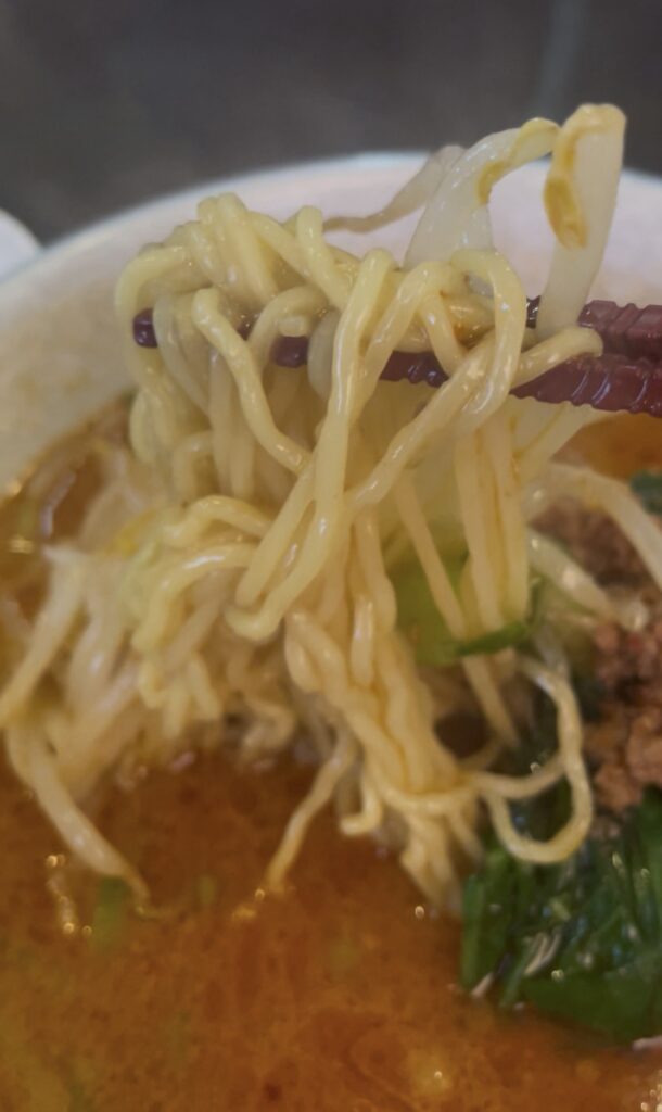 色鮮やかな担々麺の色です。あんまり赤くないですね🧐味噌ラーメンの味噌に近い色合いです。やや浮かんでいるラー油が期待を膨らませてくれます。早速スープから一口。お、、、あんまり辛くない。笑 山椒の香りもかなり弱めに感じます。その代わり味噌と胡麻のコクがすごいです!期待していたのとは少し違うけど、コレはコレで美味ですね😏 久々に痺辛控えめの担々麺に出会いました!味噌とねり胡麻を使っているのかスープの濃度もややあるように感じます。飲み込んだ後の口の中に広がる味噌と胡麻感は、まさしく担々麺です。