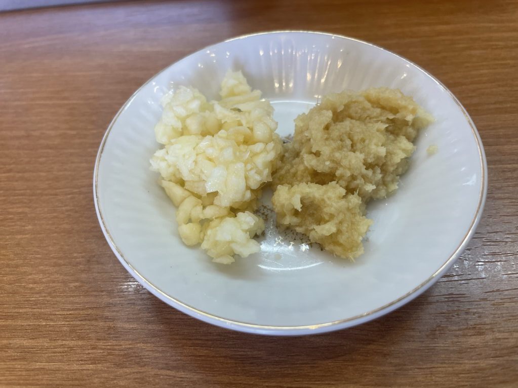 最後にオーダーの際に頼んだニンニクと生姜をトッピング!別皿オーダーも受けている様で、別皿でもらいました。ニンニク生姜で破壊力のある湯麺に仕上げてあっという間に完食です!