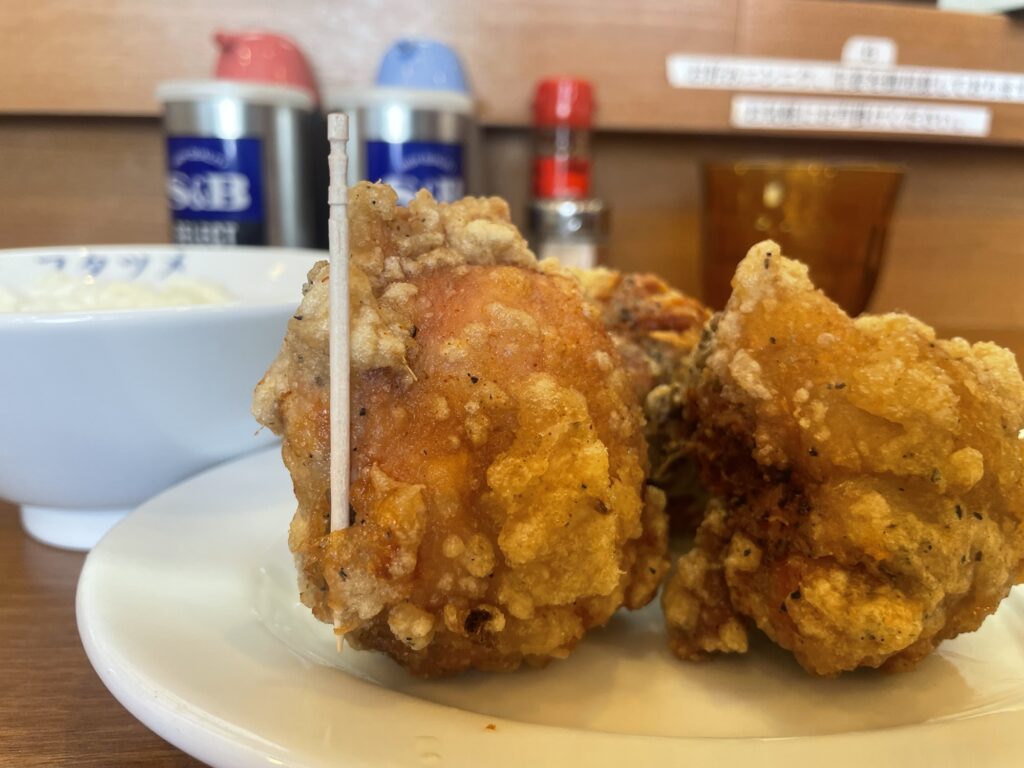このサイズ、、、圧倒的存在感です。大きすぎます。毎回頼むたびにセットの量ではないよなー。って思っている営業マンです。でも、ついつい頼んでしまうこの唐揚げセット。早速一口。衣はサクサクで口の中が切れます!笑 下味には塩とニンニクをふんだんに使っていて、しっかりとした味がついていて、パンチのある逸品になってます。噛めば分かる、口の中に広がるジューシーな鶏もも肉は絶品です😋口の中から溢れ出しそうなくらいジューシーでクセになる。ラーメンと唐揚げでライスを食す🍚最高です☺️