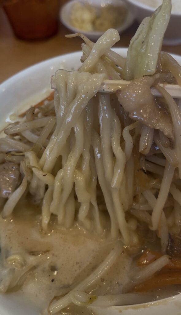 お次は太めのちぢれ麺を一口。歯応えも程よくあり、小麦の味もしっかり味わえる太さでモチモチしています。このくらい極濃なスープにはこれくらい主張強めの麺を合わせないと、スープに飲まれてしまいそうですね。それがないって事は完璧な麺ですね🫢